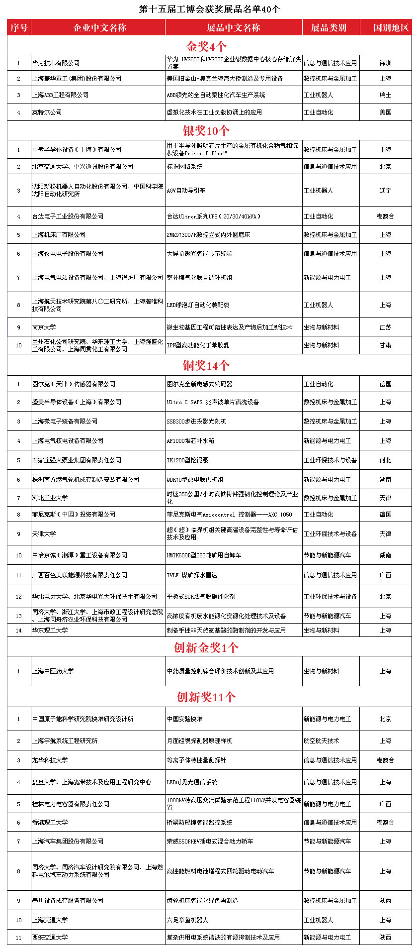 11月7日下午,第十五屆中國國際工業(yè)博覽會獲獎(jiǎng)?wù)蛊吩u選結(jié)果在N3館特設(shè)的評獎(jiǎng)?wù)故緟^(qū)揭曉。4項(xiàng)金獎(jiǎng)、10項(xiàng)銀獎(jiǎng)、14項(xiàng)銅獎(jiǎng)、1項(xiàng)創(chuàng)新金獎(jiǎng)、11項(xiàng)創(chuàng)新獎(jiǎng)等全部40項(xiàng)獲獎(jiǎng)產(chǎn)品從167家海內(nèi)外參展單位申報(bào)的217項(xiàng)參選產(chǎn)品中脫穎而出,斬獲榮譽(yù)。