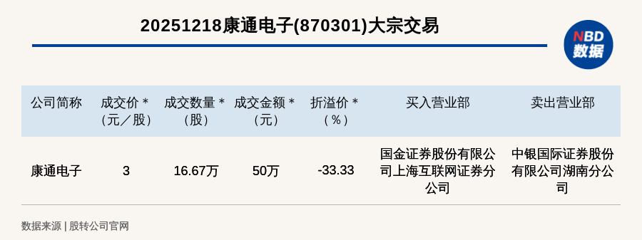 每經(jīng)訊,2025年12月18日,新三板創(chuàng)新層公司康通電子(870301,收盤價(jià):4.5元)發(fā)生一筆大宗交易,成交價(jià)3元/股,成交數(shù)量16.67萬股,成交金額50萬元,折價(jià)33.33%。買入營業(yè)部是國金證券股份有限公司上?;ヂ?lián)網(wǎng)證券分公司,賣出營業(yè)部是中銀國際證券股份有限公司湖南分公司。