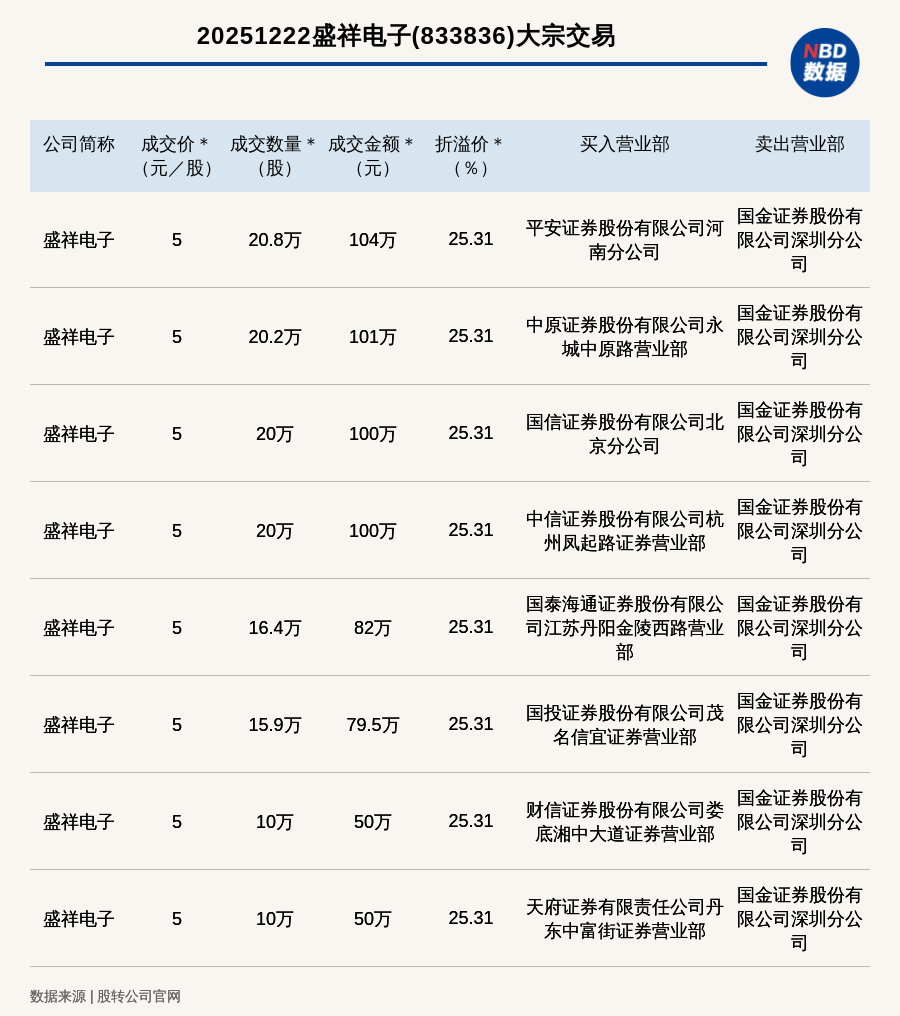 每經(jīng)訊,2025年12月22日,新三板創(chuàng)新層公司盛祥電子(833836,收盤價(jià):3.99元)發(fā)生8筆大宗交易,總成交金額為666.5萬元,成交金額最高的一筆成交價(jià)5元/股,成交數(shù)量20.8萬股,成交金額104萬元,溢價(jià)25.31%。買入營業(yè)部是平安證券股份有限公司河南分公司,賣出營業(yè)部是國金證券股份有限公司深圳分公司。
