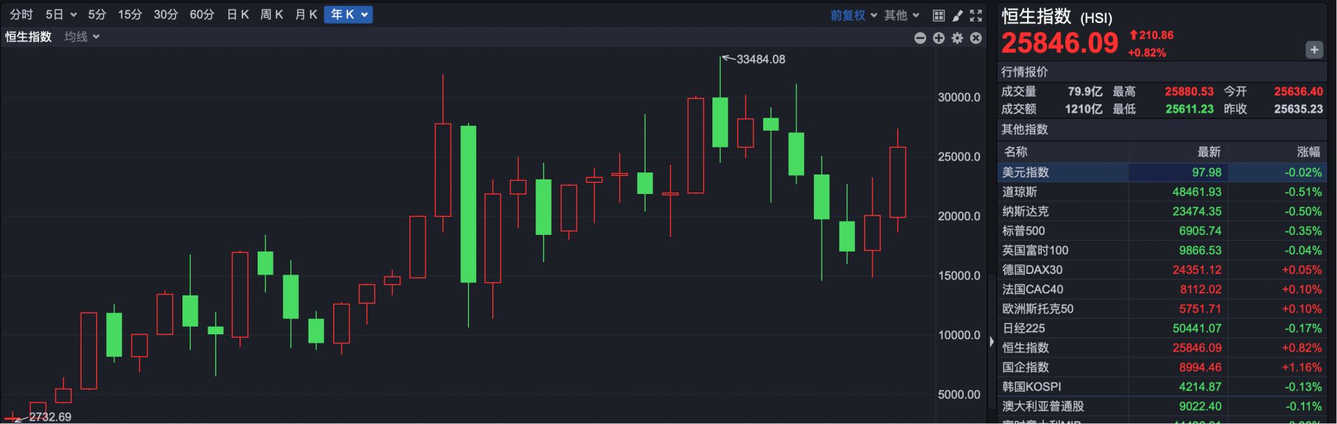 今年的港股整體行情是非常強的,從指數(shù)來看,領先全球主要股市。但是,恒生指數(shù)已經連續(xù)大漲了兩年,2024年累計漲幅17%,今年累計漲幅超過28%。盡管很多機構明年依舊非??春茫覀€人不敢這么樂觀。大家可以看看恒指的年K線圖,連續(xù)大漲兩年之后,第三年是很難繼續(xù)維持超強行情的。除非遇到2003年到2007年那種長牛行情。