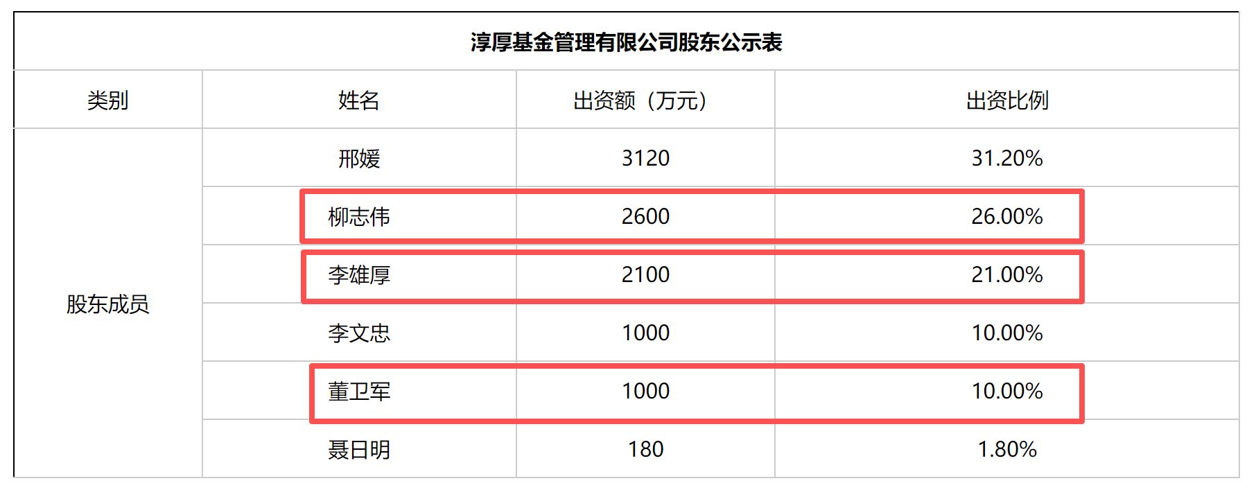 證監(jiān)會在2018年10月12日發(fā)布了《關(guān)于核準設(shè)立淳厚基金管理有限公司的批復(fù)》。其中顯示,核準淳厚基金注冊資本為1億元人民幣,股權(quán)結(jié)構(gòu)全部為個人股東,包括邢媛、柳志偉、李雄厚、李文忠、董衛(wèi)軍、聶日明。