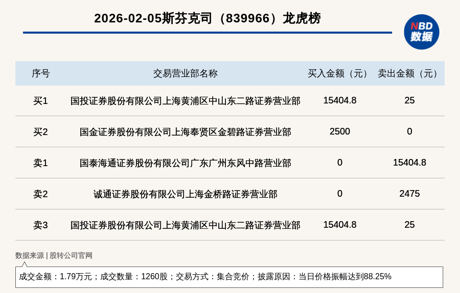 每經(jīng)訊,2026年2月5日,新三板基礎(chǔ)層公司斯芬克司(839966,收盤價(jià):25元)登上龍虎榜,交易方式是集合競(jìng)價(jià),披露原因是當(dāng)日價(jià)格振幅達(dá)到88.25%,成交數(shù)量1260股,成交金額1.79萬(wàn)元。買一席位為國(guó)投證券股份有限公司上海黃浦區(qū)中山東二路證券營(yíng)業(yè)部,買入1.54萬(wàn)元;賣一席位為國(guó)泰海通證券股份有限公司廣東廣州東風(fēng)中路營(yíng)業(yè)部,賣出1.54萬(wàn)元。