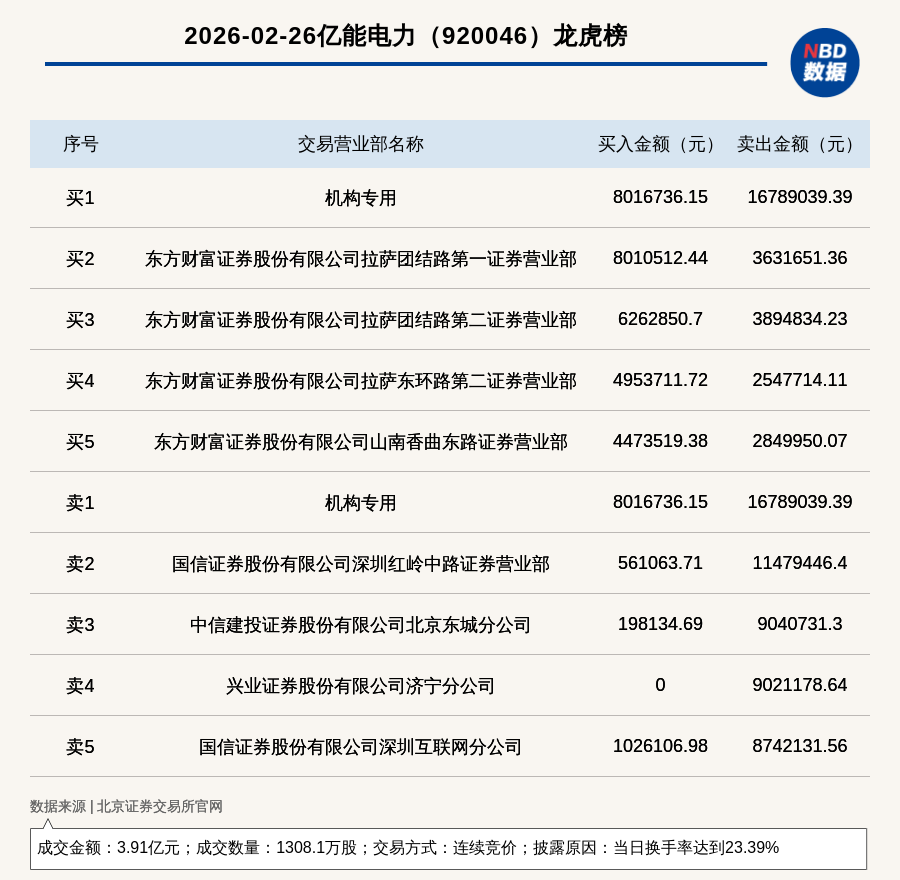 每經(jīng)訊,2026年2月26日,北交所上市公司億能電力(920046,收盤價(jià):29.91元)登上龍虎榜,交易方式是連續(xù)競價(jià),披露原因是當(dāng)日換手率達(dá)到23.39%,成交數(shù)量1308.1萬股,成交金額3.91億元。買一席位為機(jī)構(gòu)專用,買入801.67萬元;賣一席位為機(jī)構(gòu)專用,賣出1678.9萬元。