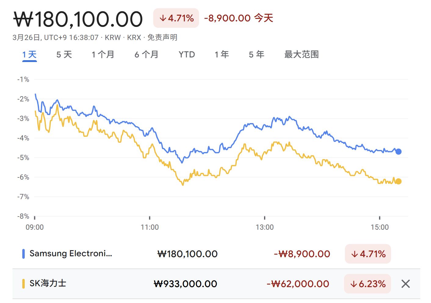 負面情緒迅速擴散至亞洲市場。3月26日,韓國SK海力士股價下跌6.23%,市值損失44.18萬億韓元(約合293.8億美元);三星電子也下跌了4.71%,市值損失57.83萬億韓元(約合384.5億美元)。