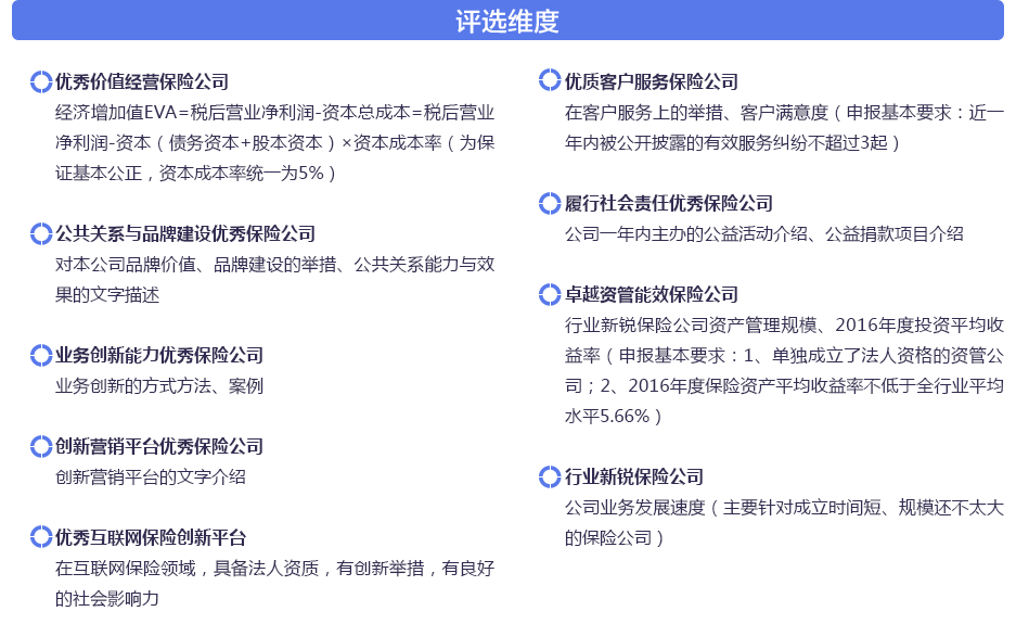 本次評選將秉持客觀真實、公正透明、范圍廣泛的原則,以“第5個保險公眾宣傳日”活動為契機,再次將視角聚焦于新生態(tài)環(huán)境下中國保險業(yè)最具經營智慧的風云企業(yè),力求準確把握保險風云脈絡。榜單以壽險、產險、資管為經度,以經營理念、品牌建設、業(yè)務創(chuàng)新、客戶服務、償付能力、社會責任、資管能效為緯度來設置獎項。