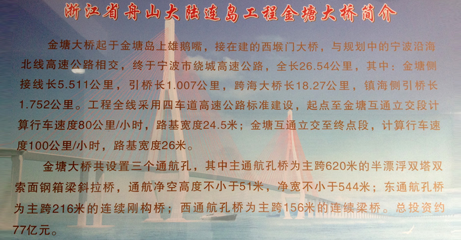 金塘大橋是舟山大陸連島工程5座橋梁中規(guī)模最大的跨海大橋,整個(gè)大陸連島工程中,二期金塘大橋與、西堠門大橋是整個(gè)舟山大陸連島工程最為關(guān)鍵一環(huán)”。